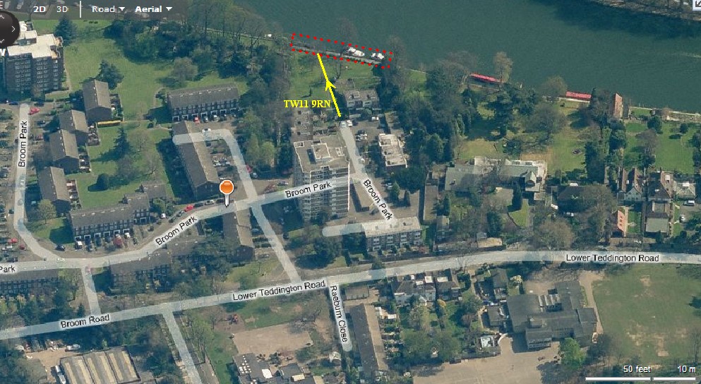 The riverside moorings are situated on the bank of the Thames at the border of Hampton Wick with Teddington at Broom Park.